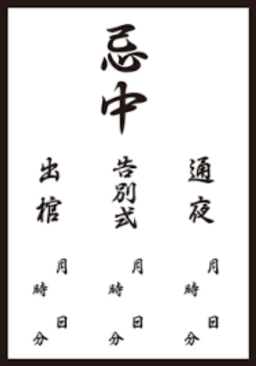書き方:中央に大きく「忌中」と墨書き。周囲を黒い太枠で囲むことが多い。